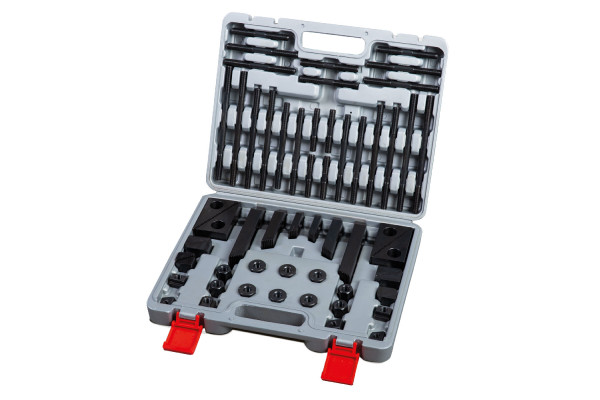 S praktickým stojánkem. Metrické závity. S 24 svorní. 75/100/125/150/175/200 mm. 6 kusů upínacích T-šroubů, 6 matic. 4 prodloužené matice, 6 upínacích desek. 6 kusů upínacích bloků.Pro velikost T-drážky 18 mm, M 16.