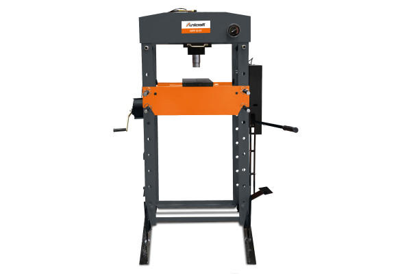 Hydraulický lis s robustným zváraným rámom, nožným aj ručným ovládaním a konvenčným vybavením.